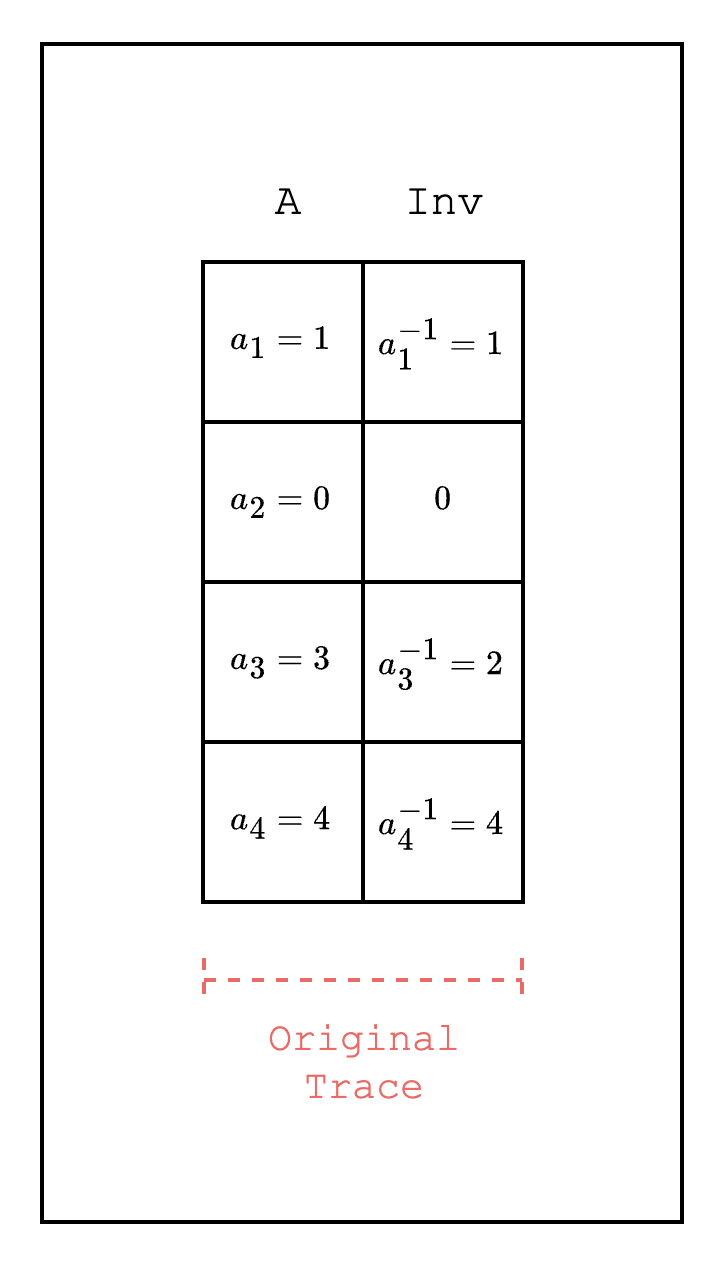 Checking that a certain field element is zero is a common use case when writing AIRs. To do this efficiently, we can use the property of finite fields that a non-zero field element always has a multiplicative inverse. For example, in Figure 2, we want to check whether a field element in is zero. We create a new column that contains the multiplicative inverse of each field element . We then use the multiplication of the two columns and check whether the result is 0 or 1. Note that if the existing column has a zero element, we can insert any value in the new column since the multiplication will always be zero. This way, we can create a constraint that uses theIsZero condition as part of the constraint, e.g. , which checks if is 0 and if is not 0.