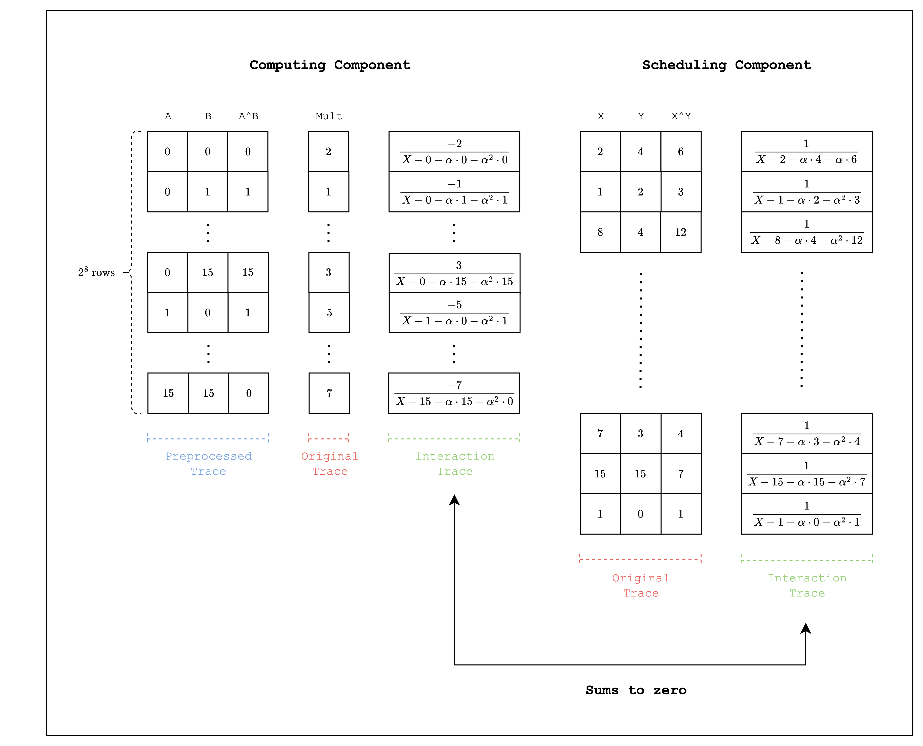 We can also handle XOR operations as part of the AIR. First, as we did in the Components section, we create a computing component and a scheduling component. Then, we connect the two components using lookups: the computing component sets the LogUp value as a negative multiplicity and the scheduling component sets the same value as a positive multiplicity. For example, Figure 4 shows the XOR operation for 4-bit integers. To accommodate the entire combination of inputs, the size of the trace for the computing component is rows. Note that the size of the trace for the scheduling component does not have to be the same as the computing component.